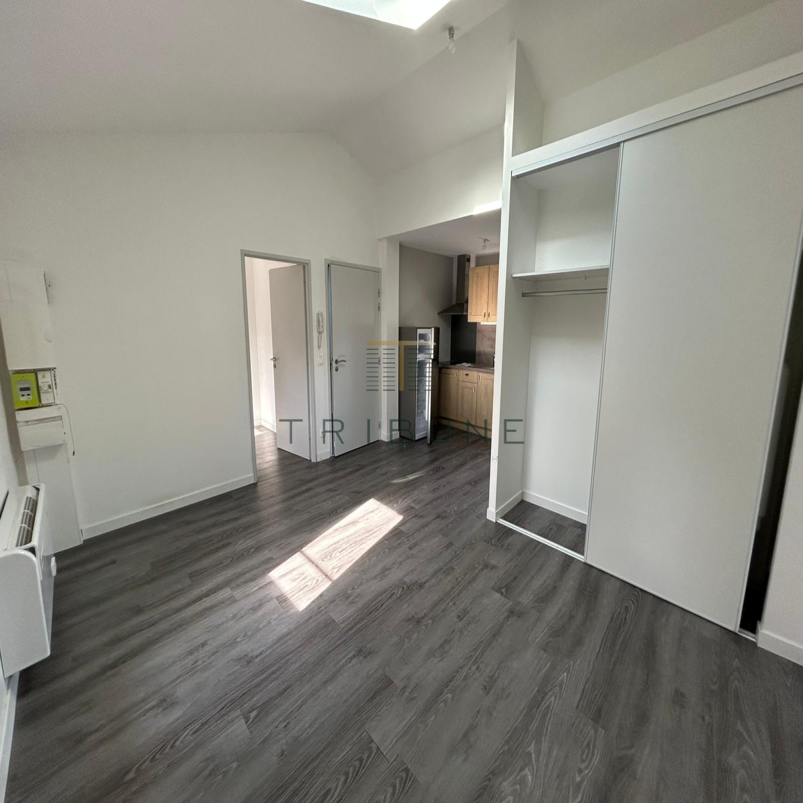 Ce logement fonctionnel propose une pièce de vie lumineuse avec coin kitchenette aménagé et semi-équipé comprenant meubles de rangement, plaque vitrocéramique deux feux, hotte et réfrigérateur. Un bureau attenant complète l’espace, idéal pour les études ou le télétravail.