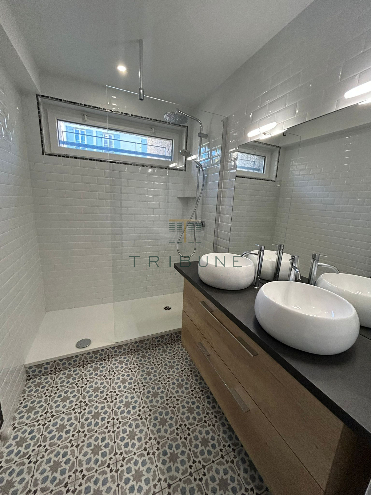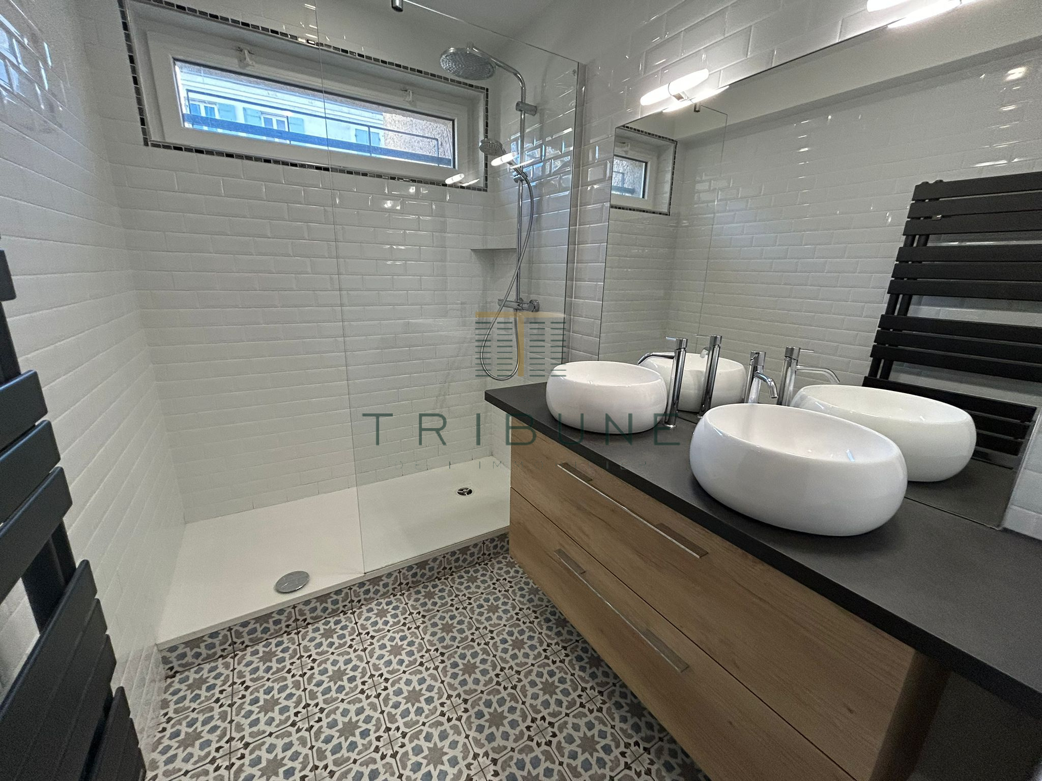 Enfin, profitez d'une jolie une salle d'eau avec douche à l'italienne, meuble double vasque et wc indépendant.