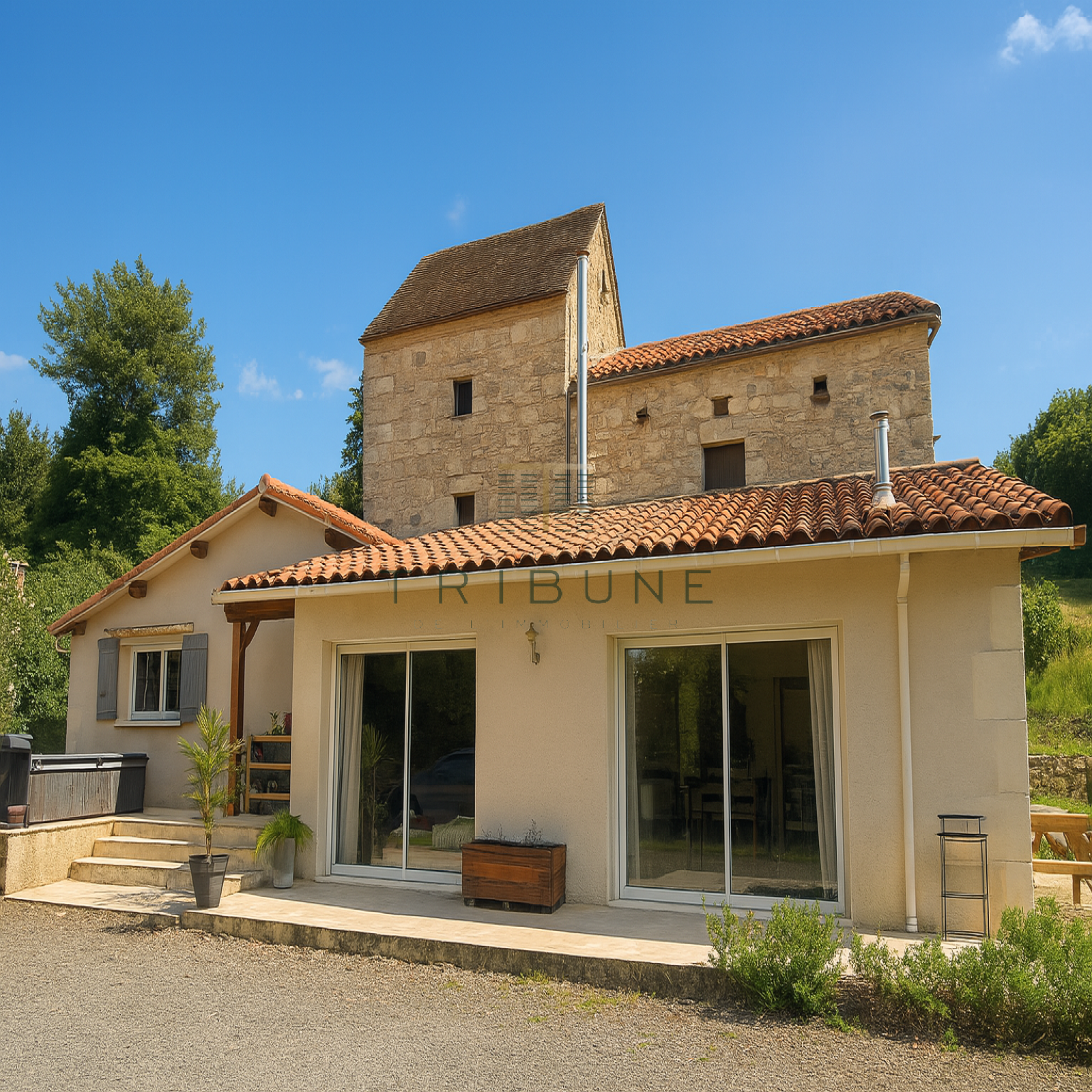La bâtisse principale, en pierre, date du début du XIXe siècle et conserve tout le charme de l’ancien : murs épais, cachet authentique, atmosphère sereine.Une extension récente de 60 m² vient compléter l’ensemble avec harmonie, apportant lumière et confort moderne. Les volumes intérieurs sont généreux, baignés de lumière naturelle. Le salon spacieux s’ouvre largement sur l’extérieur, la cuisine est fonctionnelle et les quatre chambres permettent d’accueillir famille, invités ou espace de travail selon les besoins.