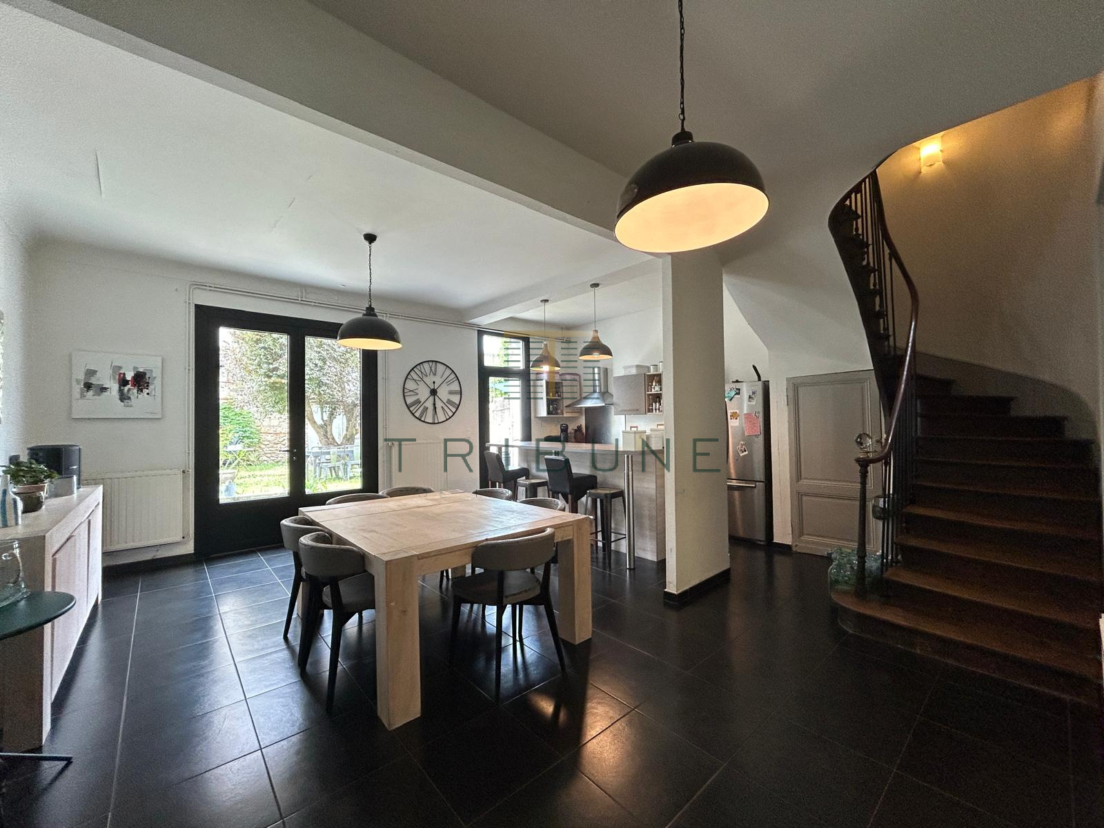 •Cuisine équipée ouverte sur un coin repas avec vue sur un jardin arboré de 100 m²