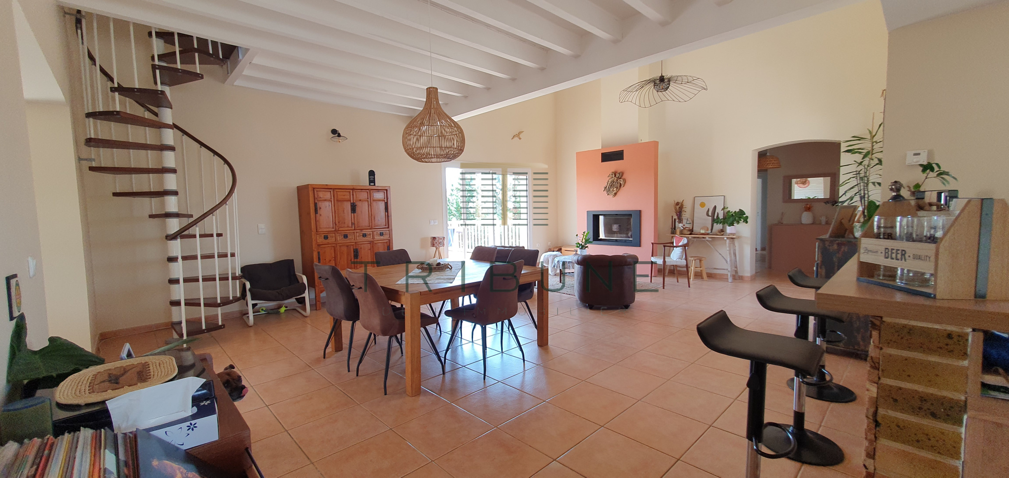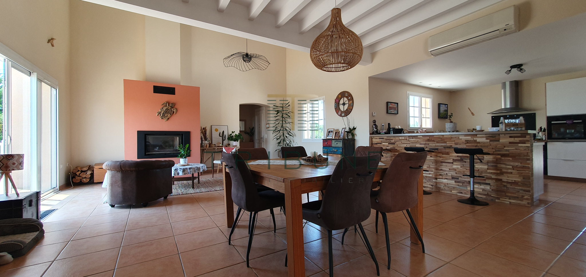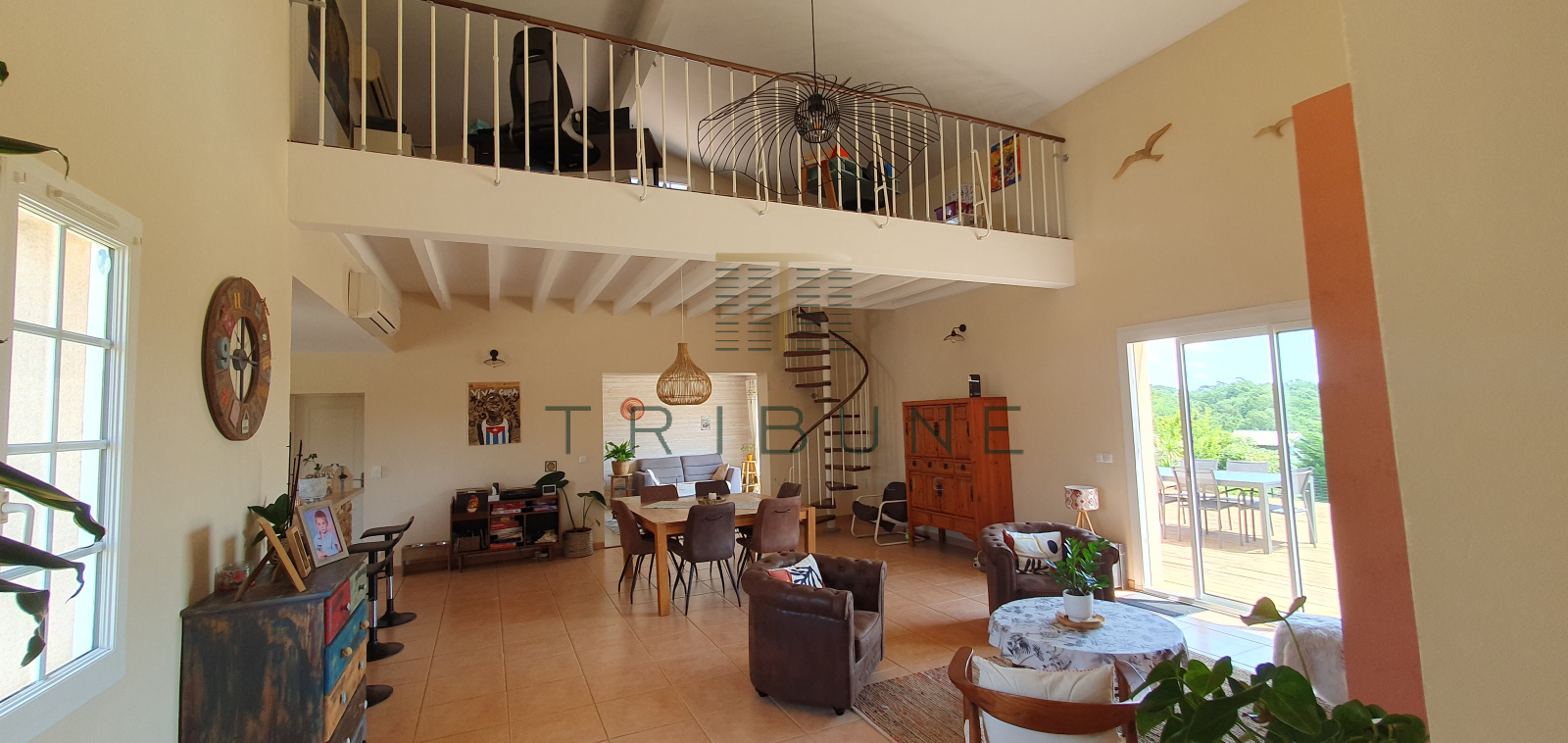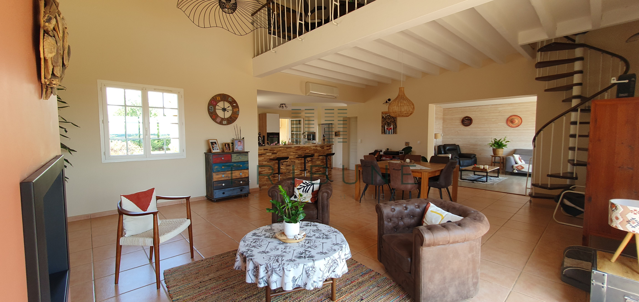 Pour la partie jour, une entrée desservant la pièce de vie de plus de 80m², comprenant une salle à manger agrémentée d'un insert et d'un plafond cathédrale ainsi que le coin cuisine, une mezzanine, et un salon.
