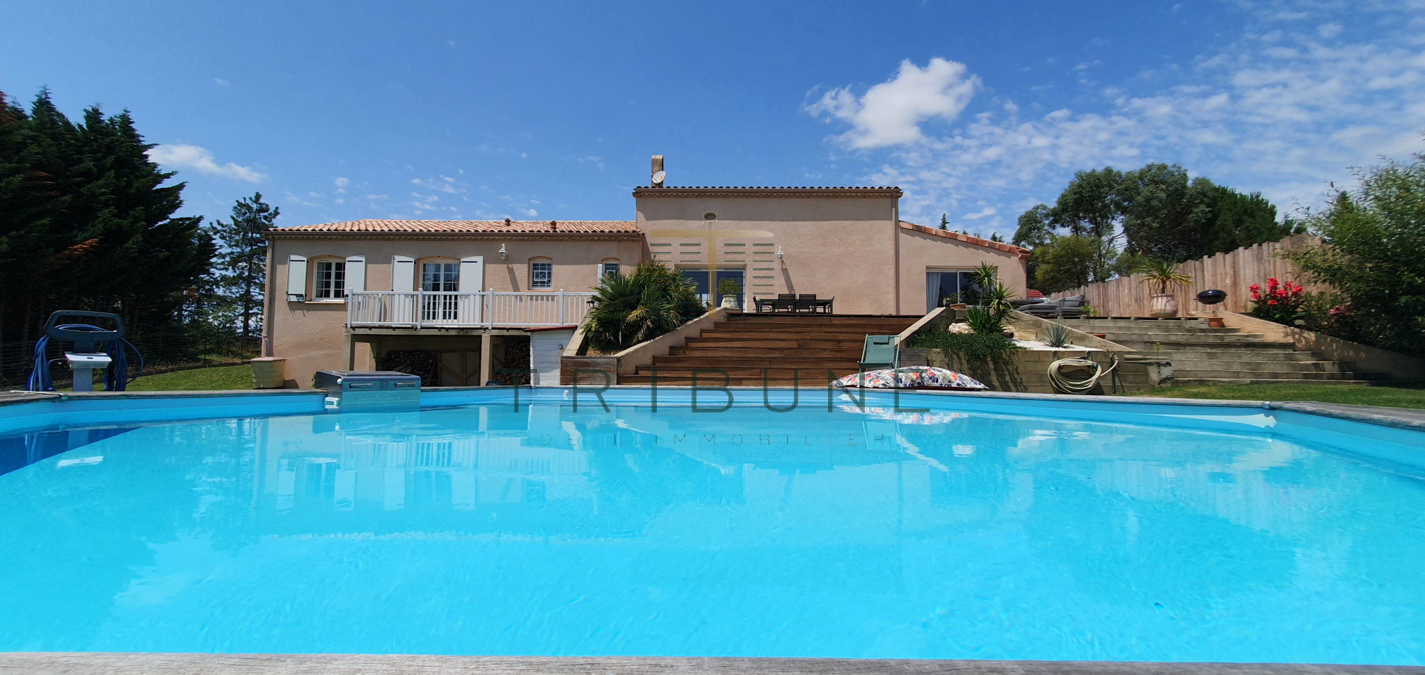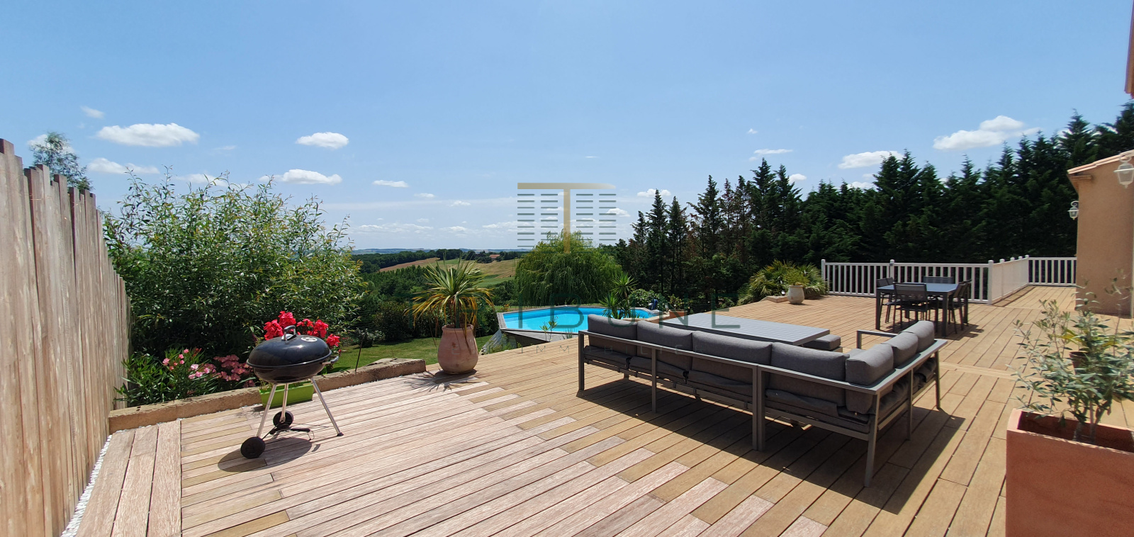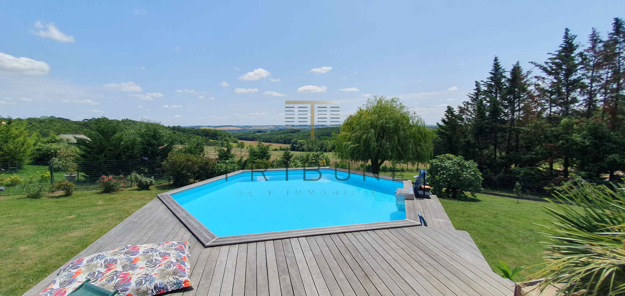 L'exterieur vous offre une belle terrasse qui vous accompagne jusqu'à la piscine hors-sol d'où vous profiterez de la vue.