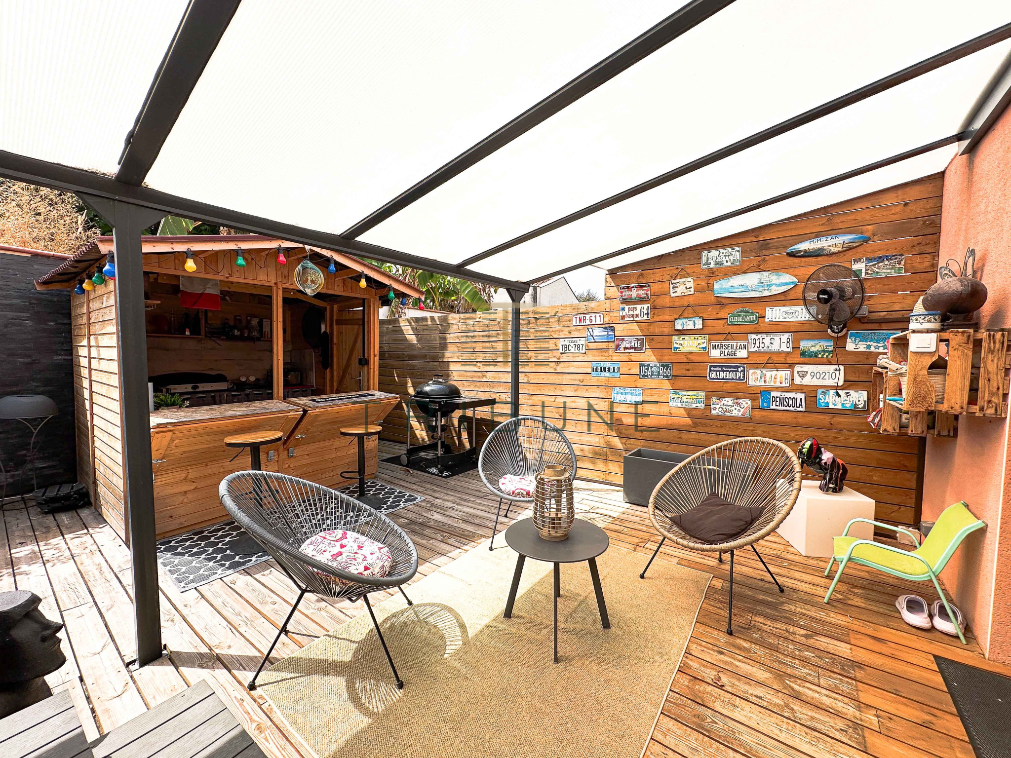 À l’extérieur, une superbe terrasse en bois accueille un SPA, une pergola ainsi qu’une cuisine d’été, offrant un espace convivial pour profiter pleinement des beaux jours.
